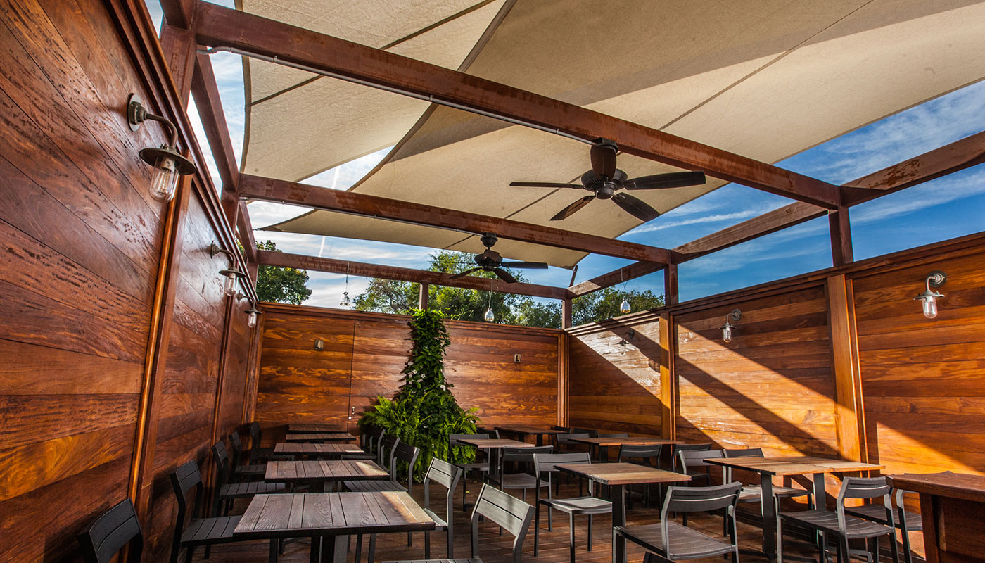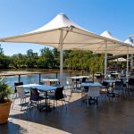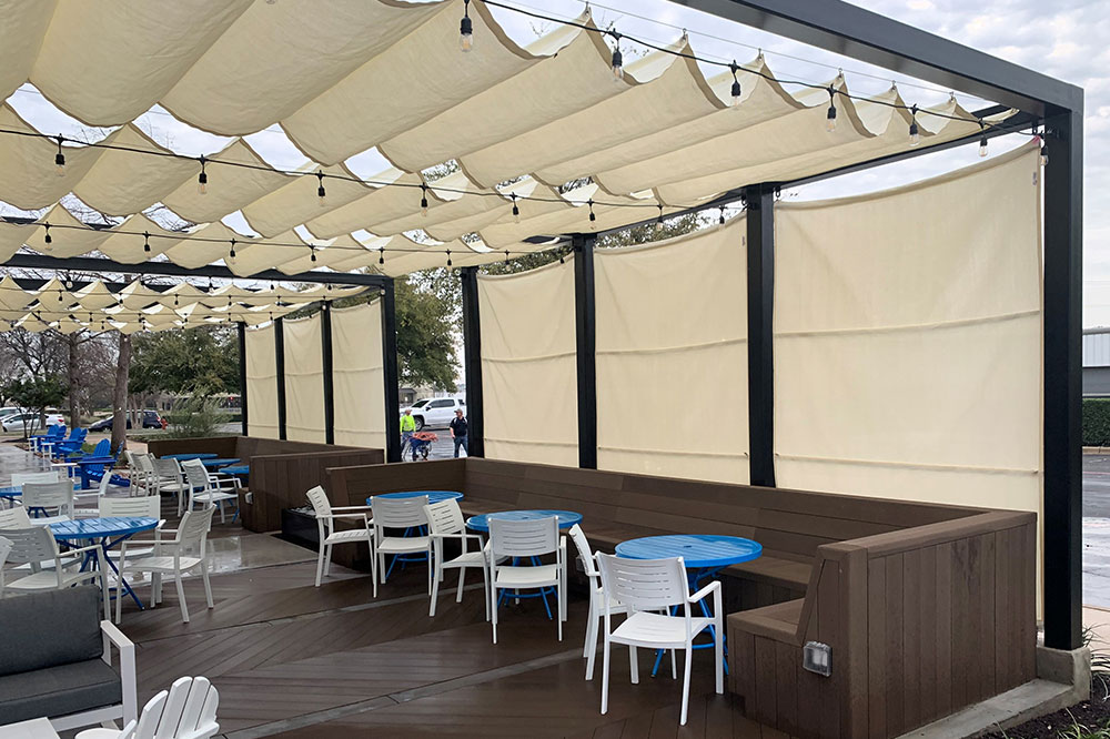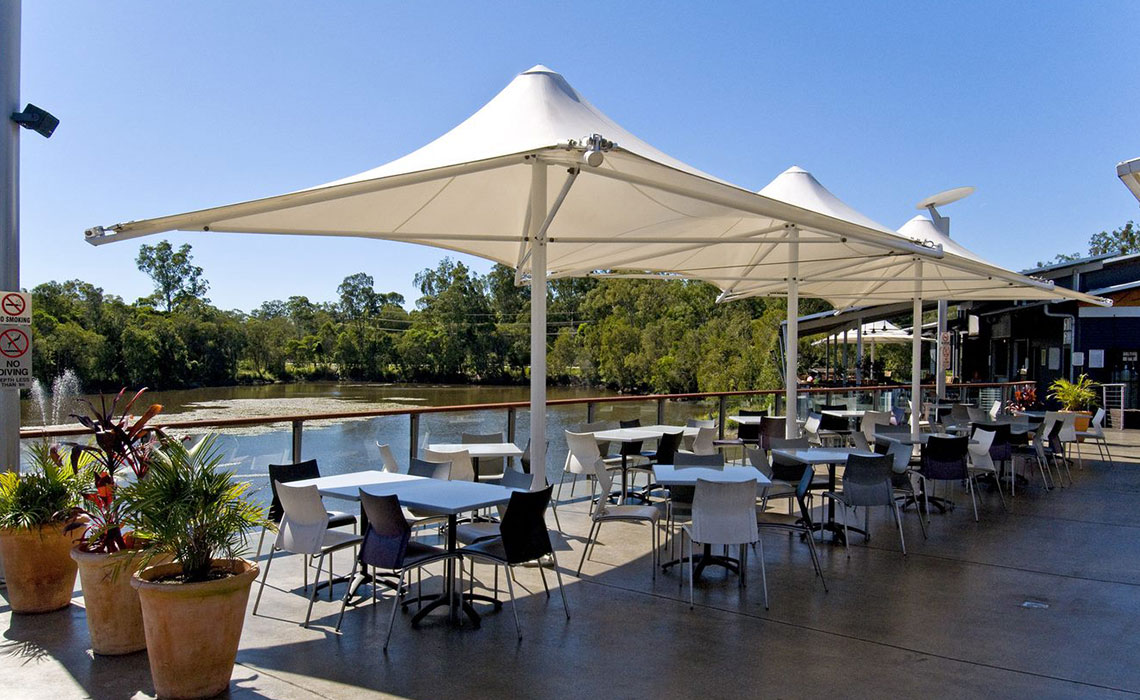 When designing shade for a restaurant, bar or cafe, maximizing the usage of their outdoor seating area is our most important consideration, boosting revenue and ensuring the quickest return on investment for the business. Shade Analysis plays a large role in any project but especially for food and beverage based businesses. We use software to analyse the position of the sun throughout your opening hours to ensure your customers are able to use your patio or seating area throughout the day. Popular shade solutions for restaurants include free-span structures, Roman Shades and Cyclone umbrellas.
