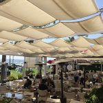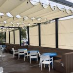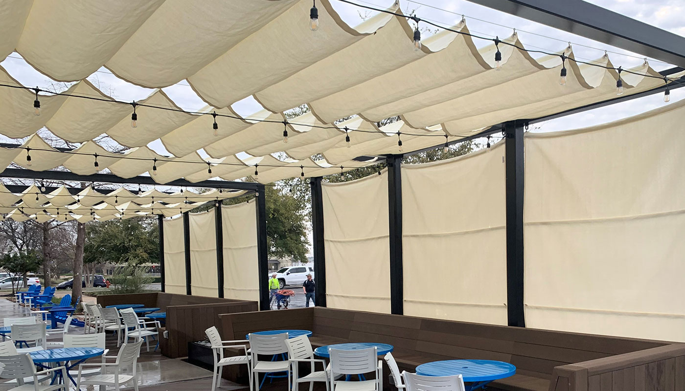 No Substantial Footings – Unlike a free-span fabric structure, which requires substantial footings to accommodate tension, Roman Shades are un-tensioned and require minimal frames. Frame posts are usually bolted to the floor instead of requiring extensive construction, which can be particularly beneficial for commercial or rented property.
